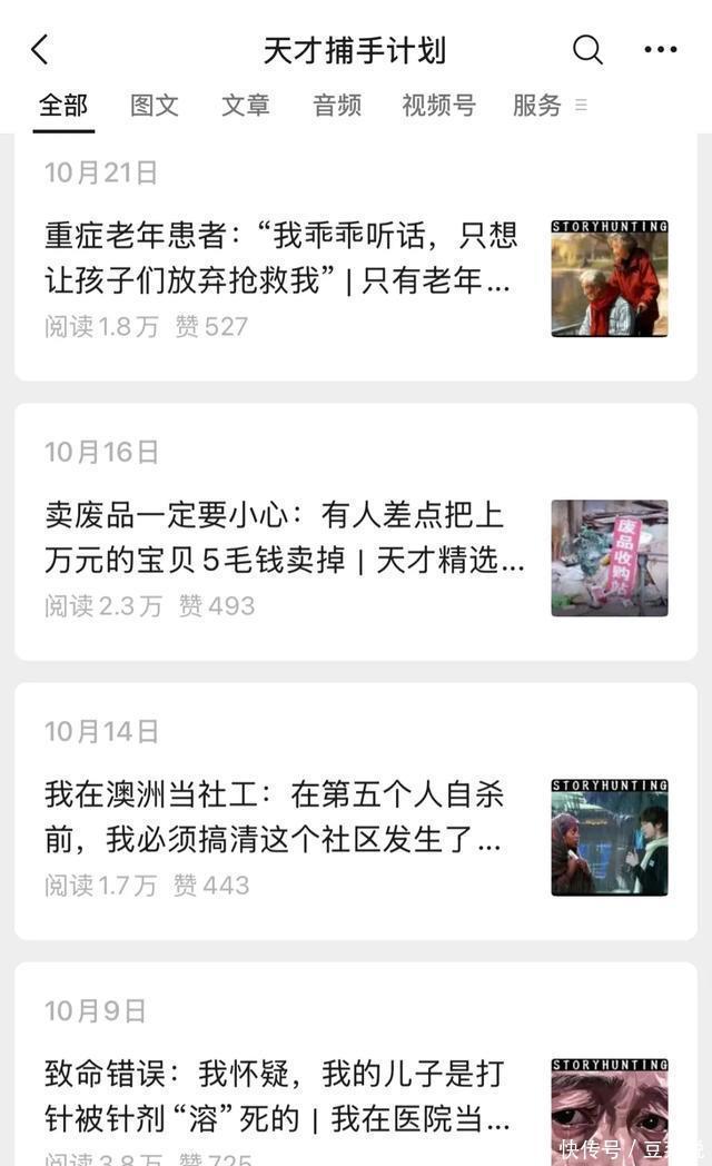而后经过出版和进一步商业化,寻求影视化的机会。 换句话说,这是一个从海量的“素人”经历中筛淘故事素材,教授“素人”写作,同时保持高频更新的一类非虚构自媒体。 以“天才捕手计划”为例,这是一个擅长发掘“关于人命和人性”类故事的非虚构自媒体平台。故事题材主要包括职业、罪案、历史(包括战争)、传奇(普通人的传奇经历)四大赛道,整体风格强调黑色、现实和奇观。