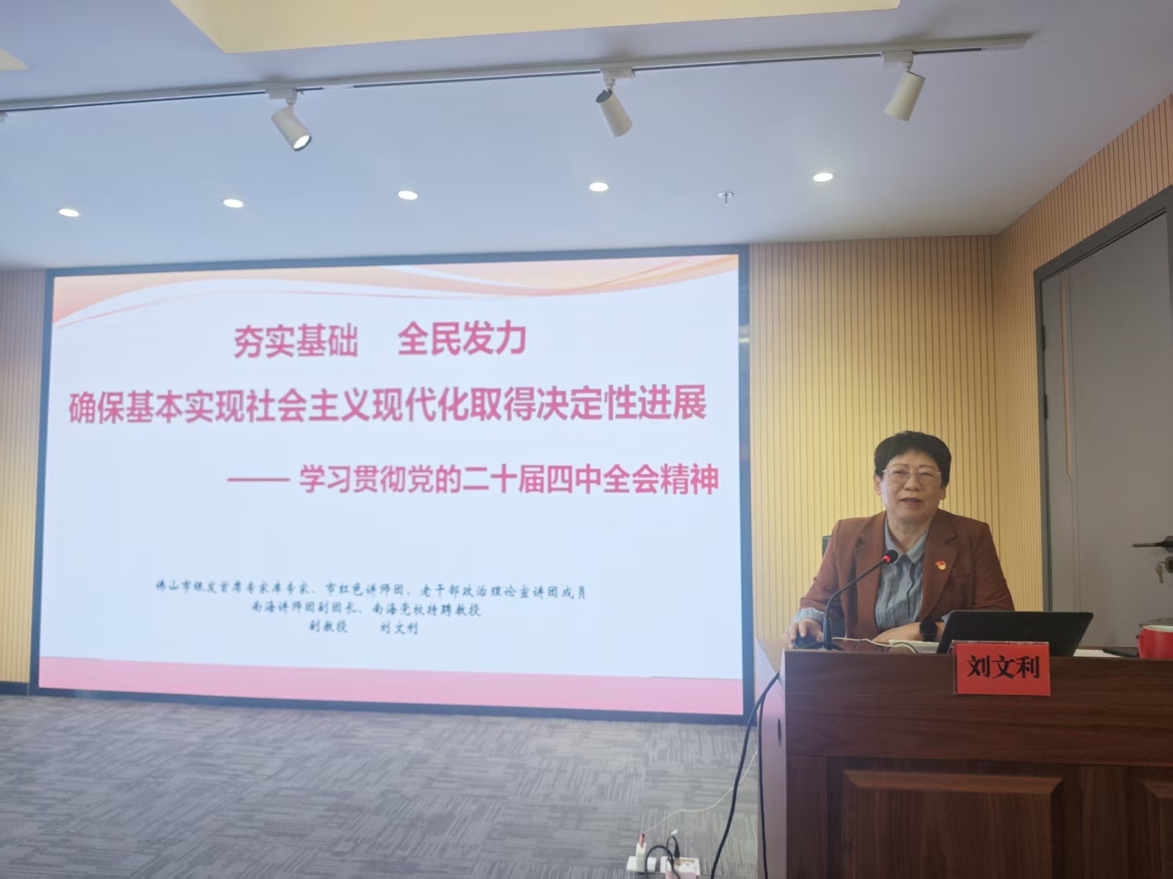 11月21日在镇委党校举办学习贯彻党的二十届四中全会精神宣讲会暨大沥镇机关党组织2025年第四季度专题党课教育,特邀佛山市红色讲师团成员、南海讲师团副团长刘文利作《夯实基础 全民发力 确保基本实现社会主义现代化取得决定性进展——学习贯彻党的二十届四中全会精神》专题授课,刘教授围绕党的二十届四中全会的重大意义、“十四五”时期我国发展取得的重大成就、“十五五”时期经济社会发展的重大意义、系统部署、根本保证等方面进行系统梳理深入剖析。刘教授表示,作为佛山中心城区之一的大沥,要立足自身定位,保持“初心、信心、决心、恒心、同心”,挺起高质量发展“硬脊梁”、打造大湾区协同融通“强枢纽”、绘就城乡融合振兴“新图景”、书写全体民生幸福“暖心底色”,勉励大沥走在前、作示范、挑大梁,扎实推进中国式现代化的大沥实践。