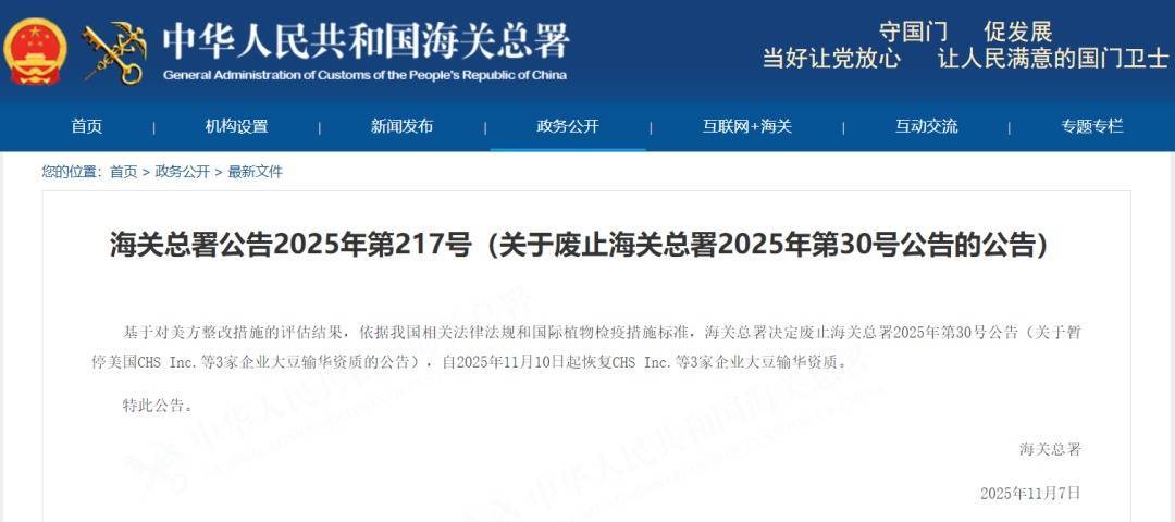 基于对美方整改措施的评估结果,依据我国相关法律法规和国际植物检疫措施标准,海关总署决定废止海关总署2025年第30号公告(关于暂停美国CHS Inc.等3家企业大豆输华资质的公告),自2025年11月10日起恢复CHS Inc.等3家企业大豆输华资质。