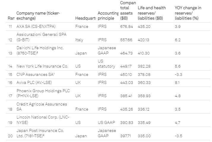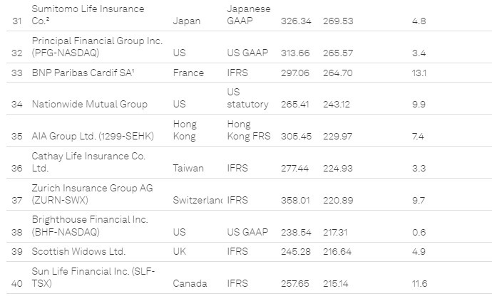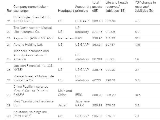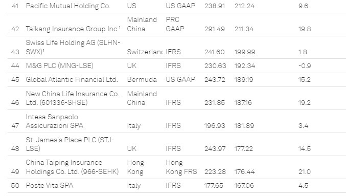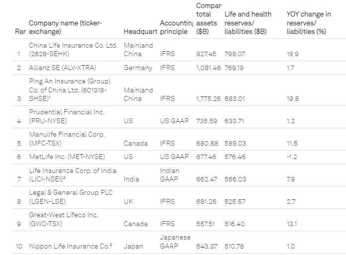 报告称,全球人寿保险前50强榜单主要基于寿险、健康险和投资合同准备金或负债进行排名。排名中,中国人寿以7980.7亿美元的寿险与健康险准备金、9274.5亿美元的总资产、同比增长19.9%的成绩位居第一名。第二名为安联保险(德国),第三名为中国平安(中国),第四名为保德信金融(美国),第五名为宏利金融(加拿大),依次为大都会人寿(美国)、印度人寿(印度)、法通保险(英国)、永明人寿(加拿大)、日本生命保险(日本)。